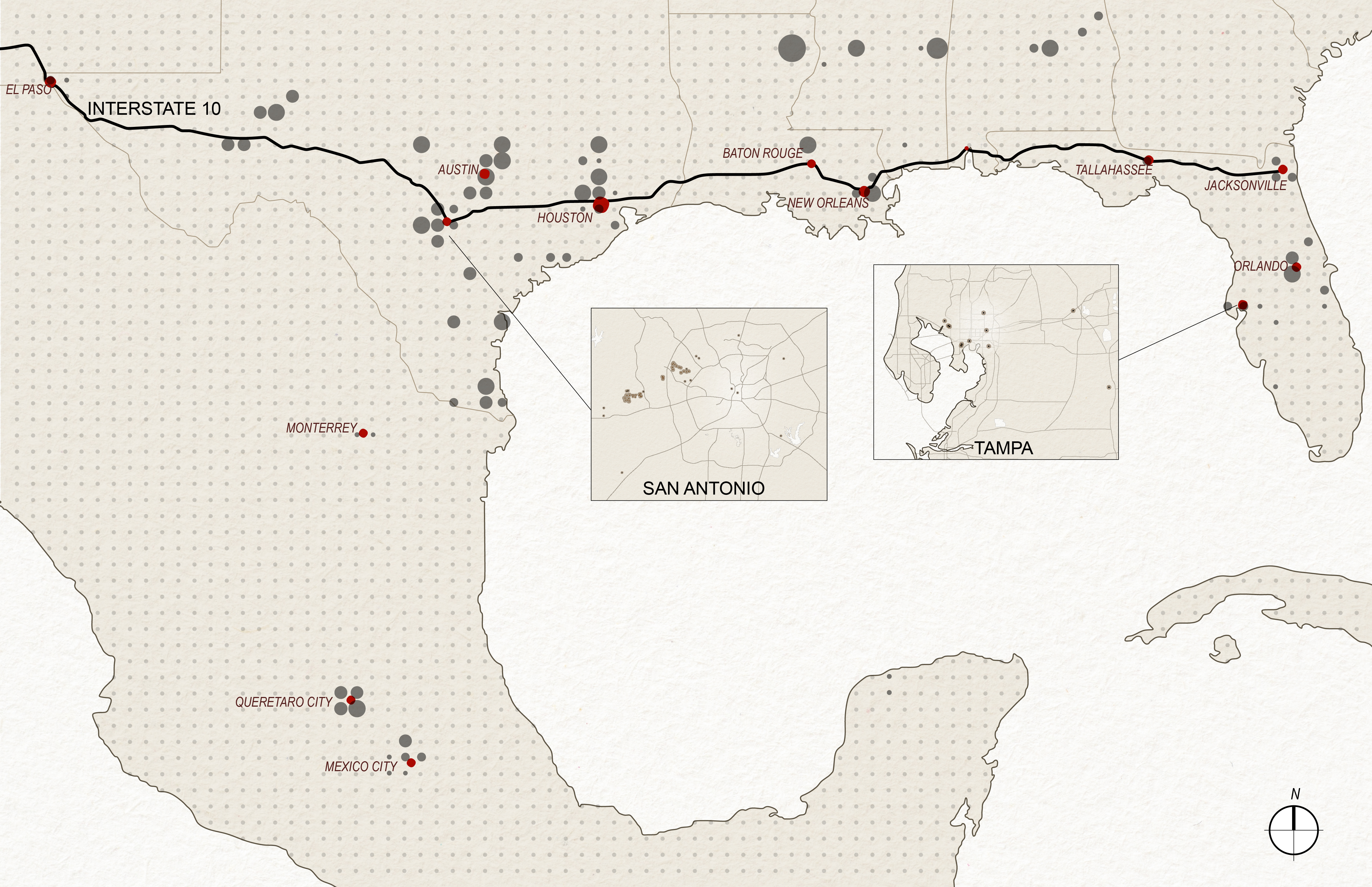Data centers are one of the most rapidly emerging building typologies in North America. These facilities store data servers and equipment necessary for supporting digital services and cloud computing, varying greatly in size, placement, and construction. This wiki provides visual and data-driven information to highlight the decision-making factors for these variations, focusing specifically on their development along the I-10 corridor and the broader Gulf Coast, including Mexico. This book begins with the broader region’s role in U.S. data infrastructure, with more detailed state and city-level analyses in the chapters that follow. The opening map offers the widest geographic view, detailing how these facilities are distributed across multiple states at various scales.