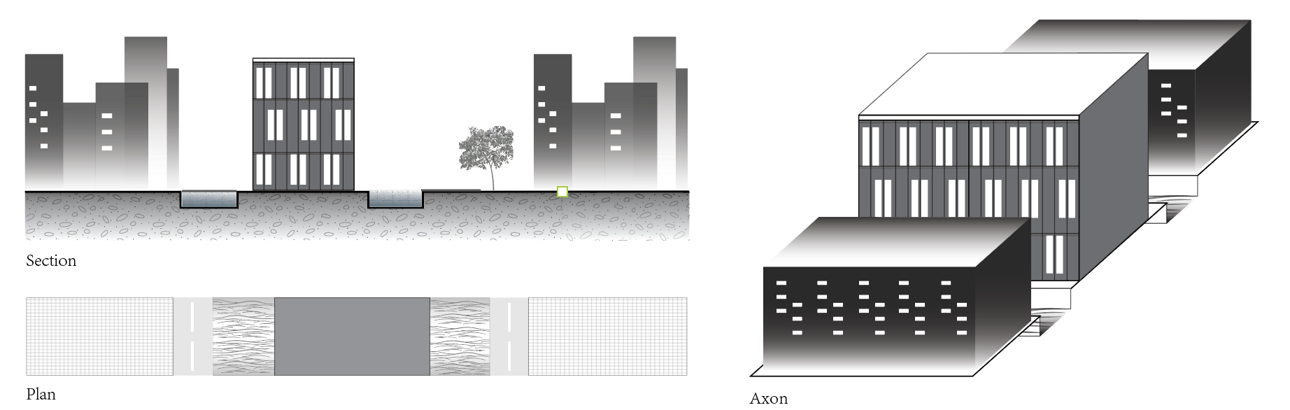 Modified topography + compacted data center + water canal + singular tree + city