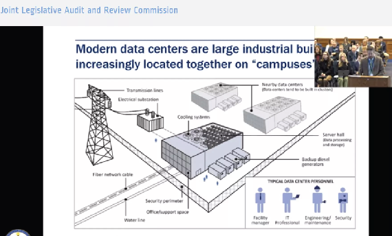 A slide from JLARC's presentation on Monday, Dec. 9, 2024, shows the typical layout of a large-scale data center